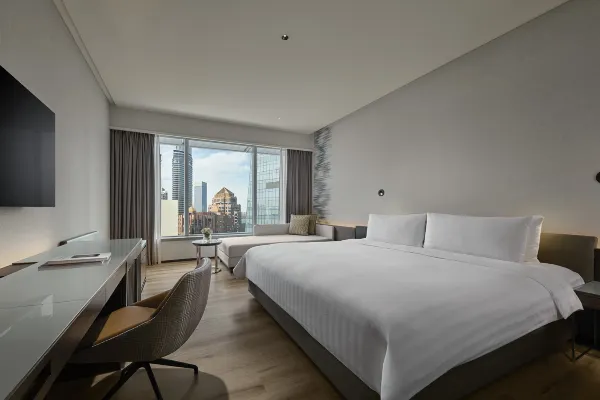 Spanning 32 m² (344 ft²), this contemporary room features floor-to-ceiling windows offering panoramic city views, filling the space with natural light.