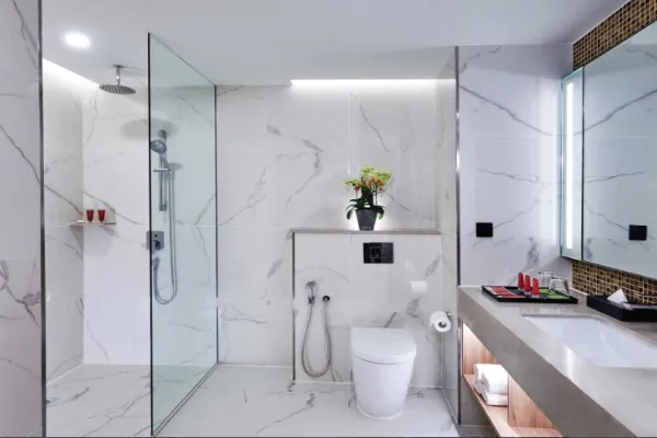 العناية الشخصية: حمام متكامل (مياه ساخنة 24 ساعة، مجفف شعر، أرواب، وسليبرز).